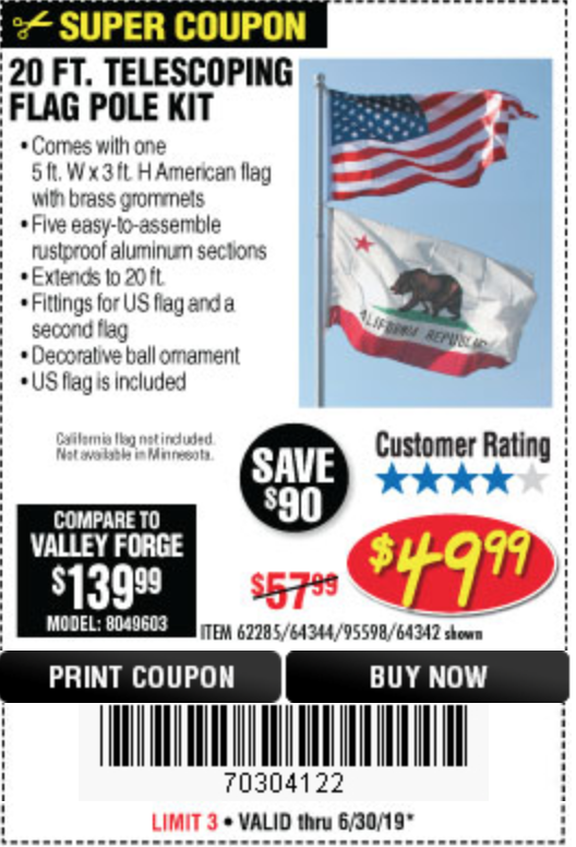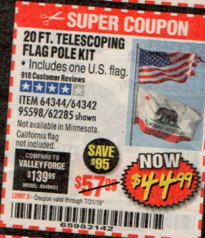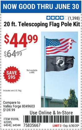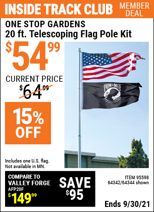 ONE STOP GARDENS 20 FT. TELESCOPING FLAG POLE KIT Lot No. 64344/95598/64342 Expired: 6/30/19 - $49.99 Coupon Code: '70304122'