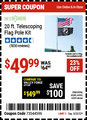 ONE STOP GARDENS 20 FT. TELESCOPING FLAG POLE KIT Lot No. 64344/95598/64342 Expired: 5/22/22 - $49.99 Coupon Code: '73544596'