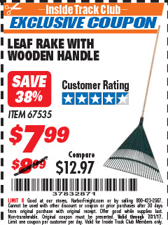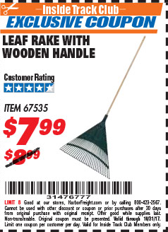ITC ONE STOP GARDENS LEAF RAKE WITH WOOD HANDLE Lot No. 67535 Expired: 10/31/17 - $7.99 Coupon Code: '31476777'