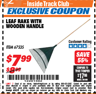 ITC ONE STOP GARDENS LEAF RAKE WITH WOOD HANDLE Lot No. 67535 Expired: 12/31/18 - $7.99 Coupon Code: '60395826'
