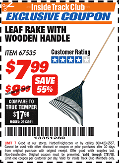 ITC ONE STOP GARDENS LEAF RAKE WITH WOOD HANDLE Lot No. 67535 Expired: 7/31/18 - $7.99 Coupon Code: '13351280'