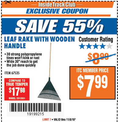 ITC ONE STOP GARDENS LEAF RAKE WITH WOOD HANDLE Lot No. 67535 Expired: 11/6/18 - $7.99 Coupon Code: '19199215'