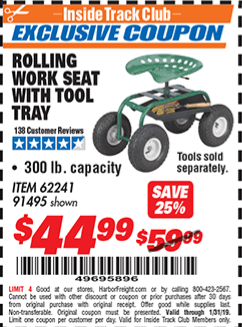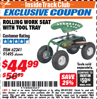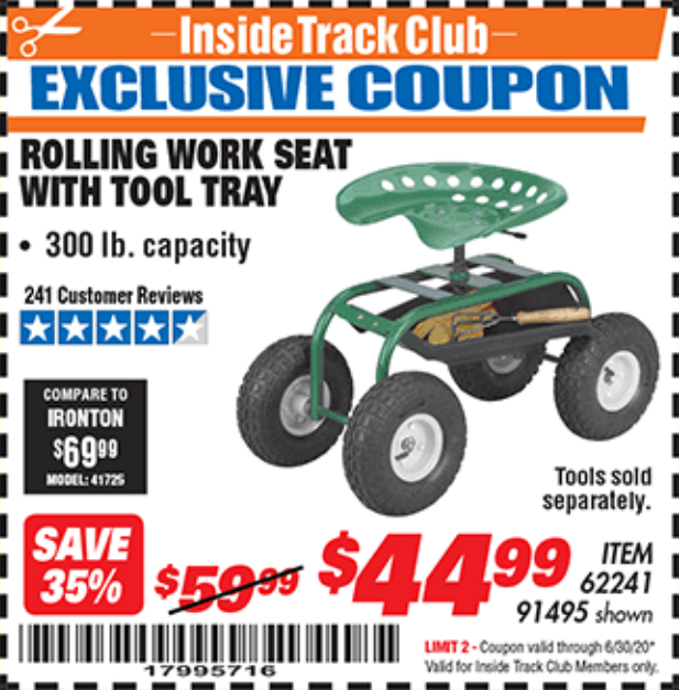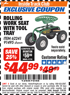 ONE STOP GARDENS ROLLING WORK SEAT WITH TOOL TRAY Lot No. 91495/62241 Expired: 6/30/20 - $44.99 Coupon Code: '39512783'