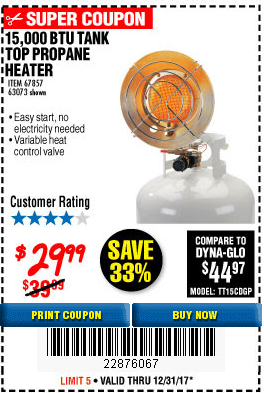 ONE STOP GARDENS WINTER 15,000 BTU TANK TOP PROPANE HEATER Lot No. 59674 Expired: 12/31/17 - $29.99 Coupon Code: '22876067'