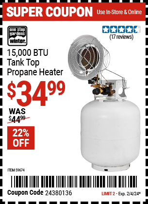 ONE STOP GARDENS WINTER 15,000 BTU TANK TOP PROPANE HEATER Lot No. 59674 Expired: 2/4/24 - $34.99 Coupon Code: '24380136'