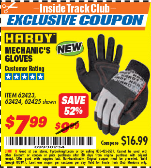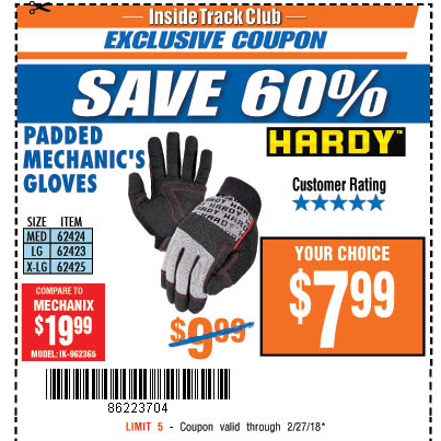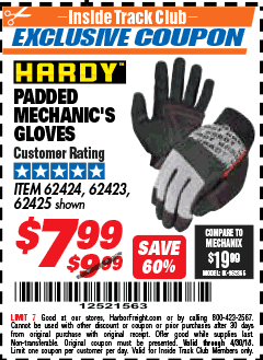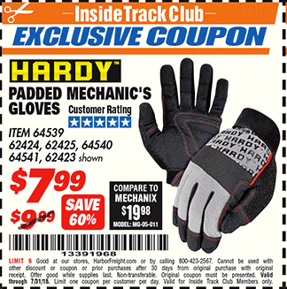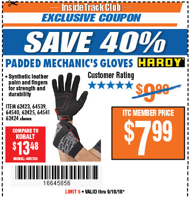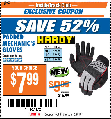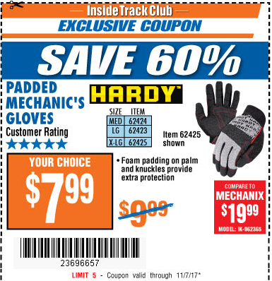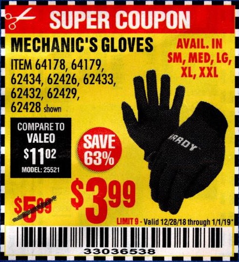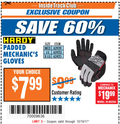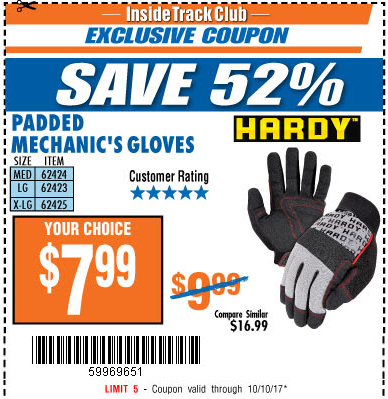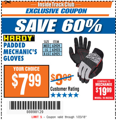 PADDED MECHANICS GLOVES Lot No. 62424/62423/62425 Expired: 1/1/19 - $3.99 Coupon Code: '33036538'