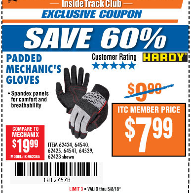 ITC PADDED MECHANICS GLOVES Lot No. 62424/62423/62425 Expired: 5/8/18 - $7.99 Coupon Code: '19127576'