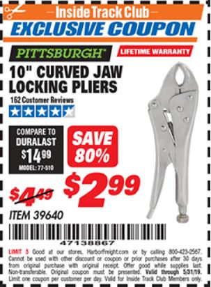 PITTSBURGH 10 IN. CURVED JAW LOCKING PLIERS Lot No. 39640 Valid Thru: 12/1/25 - $4.99 Coupon Code: '73209915' (current price - 20% = 0) add to list