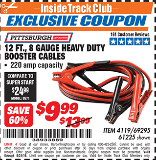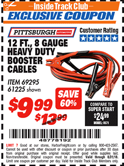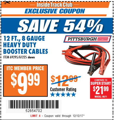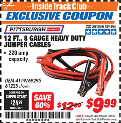 PITTSBURGH 12 FT. 8 GAUGE JUMPER CABLES Lot No. 61225/69295 Expired: 12/14/19 - $9.99 Coupon Code: '42159714'
