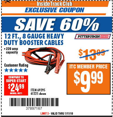 ITC PITTSBURGH 12 FT. 8 GAUGE JUMPER CABLES Lot No. 61225/69295 Expired: 1/30/18 - $9.99 Coupon Code: '63166651'