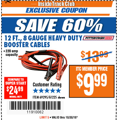 ITC PITTSBURGH 12 FT. 8 GAUGE JUMPER CABLES Lot No. 61225/69295 Expired: 10/30/18 - $9.99 Coupon Code: '11910062'
