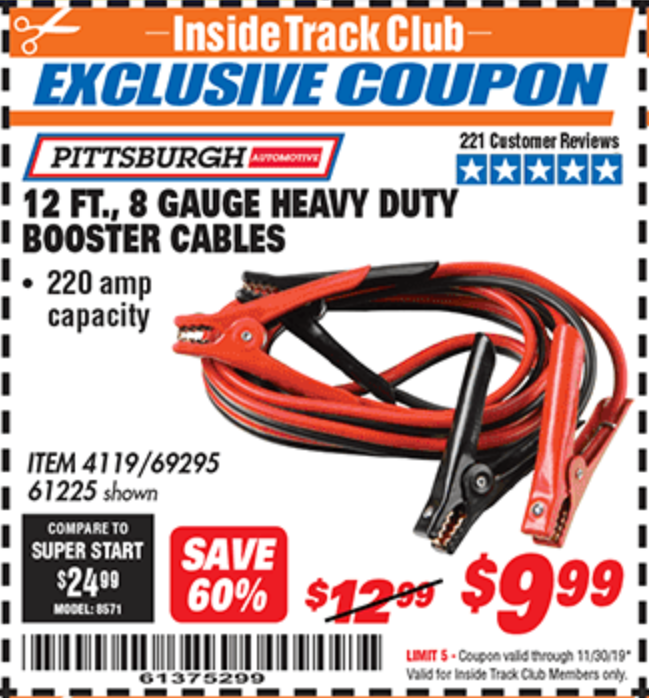 PITTSBURGH 12 FT. 8 GAUGE JUMPER CABLES Lot No. 61225/69295 Expired: 11/9/19 - $9.99 Coupon Code: '51506076'