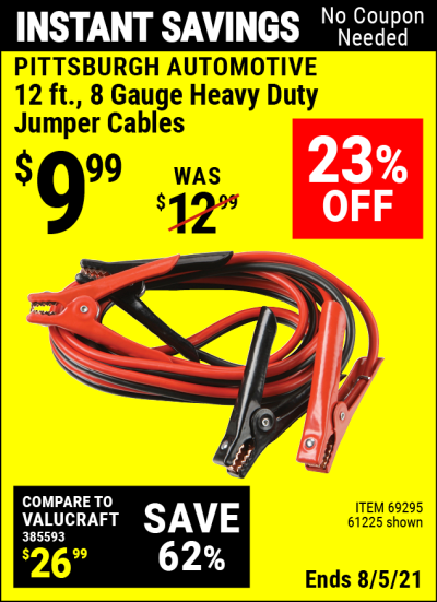 PITTSBURGH 12 FT. 8 GAUGE JUMPER CABLES Lot No. 61225/69295 Expired: 8/5/21 - $9.99 Coupon Code: 'n/a'