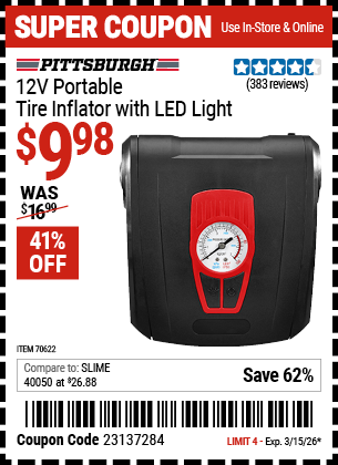 PITTSBURGH 12V PORTABLE TIRE INFLATOR WITH LED LIGHT Lot No. 70622 Expired: 3/15/26 - $9.98 Coupon Code: '23137284'
