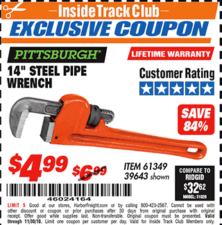 ITC PITTSBURGH 14 IN. STEEL PIPE WRENCH Lot No. 61349 Expired: 11/30/15 - $4.99 Coupon Code: '84994537'
