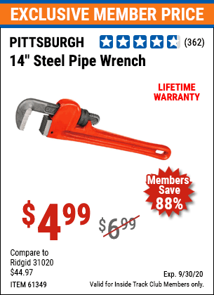 ITC PITTSBURGH 14 IN. STEEL PIPE WRENCH Lot No. 61349 Expired: 9/30/20 - $4.99 Coupon Code: '61349499'