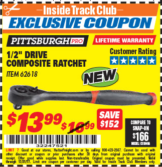 ITC PITTSBURGH 1/2 IN. DRIVE TEARDROP COMPOSITE RATCHET Lot No. 70043/62618 Expired: 12/31/18 - $12.99 Coupon Code: '47702238'