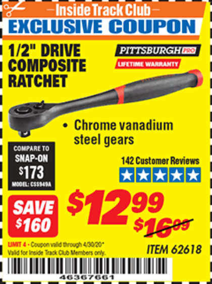 ITC PITTSBURGH 1/2 IN. DRIVE TEARDROP COMPOSITE RATCHET Lot No. 70043/62618 Expired: 4/30/20 - $12.99 Coupon Code: '46367661'