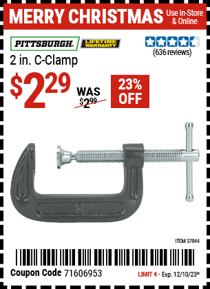PITTSBURGH 2 IN. C-CLAMP Lot No. 37844 Expired: 12/10/23 - $2.29 Coupon Code: '71606953'