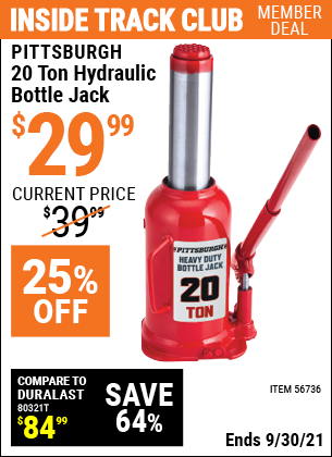 ITC PITTSBURGH 20 TON HYDRAULIC BOTTLE JACK Lot No. 56736 Expired: 9/30/21 - $29.99 Coupon Code: 'n/a'