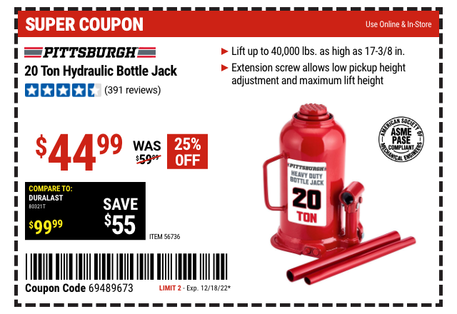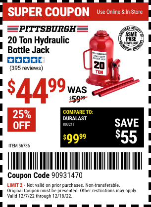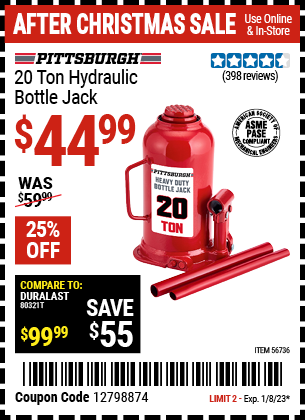 PITTSBURGH 20 TON HYDRAULIC BOTTLE JACK Lot No. 56736 Expired: 11/13/22 - $44.99 Coupon Code: '51622300'