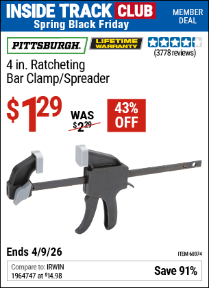 PITTSBURGH 4 IN. RATCHETING BAR CLAMP/SPREADER Lot No. 68974/46805 Expired: 1/23/19 - $0.99 Coupon Code: '28136925'