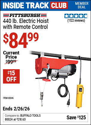 ITC PITTSBURGH 440 LB. ELECTRIC HOIST WITH REMOTE CONTROL Lot No. 60346 Valid Thru: 2/26/26 - $84.99 Coupon Code: 'n/a' (current price - 20% = 0) add to list