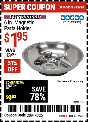 PITTSBURGH 6 IN.MAGNETIC PARTS HOLDER Lot No. 57464 Expired: 4/11/24 - $1.95 Coupon Code: '20914325'