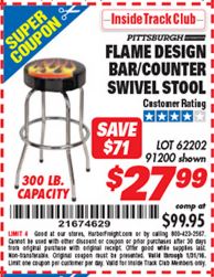 PITTSBURGH BAR/COUNTER SWIVEL STOOL WITH FLAME DESIGN Lot No. 91200/62202 Expired: 9/1/25 - $32.99 Coupon Code: '75106640'