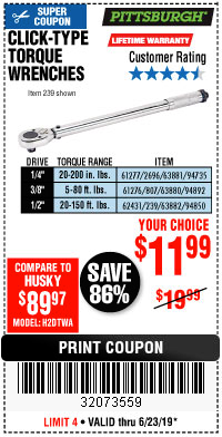 PITTSBURGH CLICK TORQUE WRENCH Lot No. 63882/63880/63881 Expired: 5/19/19 - $11.99 Coupon Code: '61799317'
