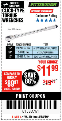 PITTSBURGH CLICK TORQUE WRENCH Lot No. 63882/63880/63881 Expired: 8/25/19 - $9.99 Coupon Code: '14068025'