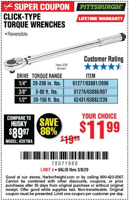 PITTSBURGH CLICK TORQUE WRENCH Lot No. 63882/63880/63881 Expired: 3/22/20 - $9.99 Coupon Code: '2172071'