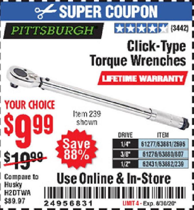 PITTSBURGH CLICK TORQUE WRENCH Lot No. 63882/63880/63881 Expired: 8/31/20 - $9.99 Coupon Code: '60231514'