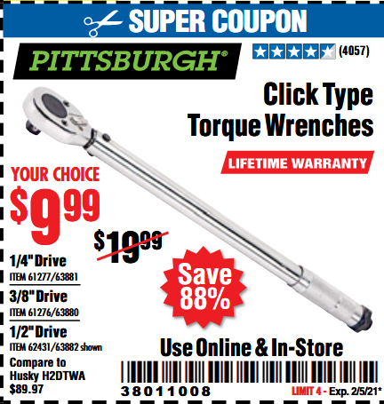 PITTSBURGH CLICK TORQUE WRENCH Lot No. 63882/63880/63881 Expired: 2/5/21 - $9.99 Coupon Code: '38011008'