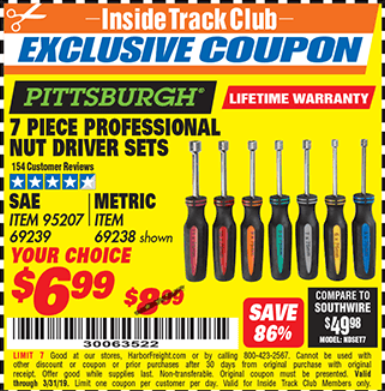ITC PITTSBURGH HOLLOW SHAFT NUT DRIVER SET, 7 PIECE Lot No. 69238/69239 Expired: 3/31/19 - $6.99 Coupon Code: '30063522'