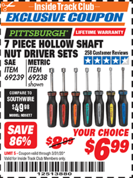 ITC PITTSBURGH HOLLOW SHAFT NUT DRIVER SET, 7 PIECE Lot No. 69238/69239 Expired: 3/31/20 - $6.99 Coupon Code: '12513880'