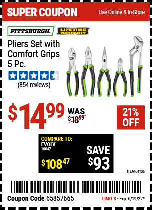 PITTSBURGH PLIERS SET WITH COMFORT GRIPS, 5 PC. Lot No. 64136 Expired: 6/2/22 - $14.99 Coupon Code: '95987813'