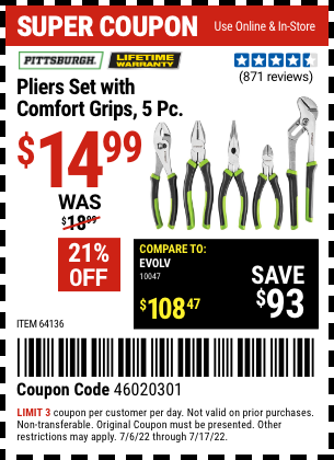 PITTSBURGH PLIERS SET WITH COMFORT GRIPS, 5 PC. Lot No. 64136 Expired: 7/17/22 - $14.99 Coupon Code: '46020301'