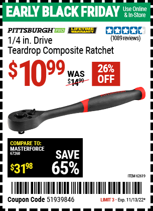 PITTSBURGH PRO 1/4 IN. DRIVE TEARDROP COMPOSITE RATCHET Lot No. 62619 Expired: 11/13/22 - $10.99 Coupon Code: '51939845'