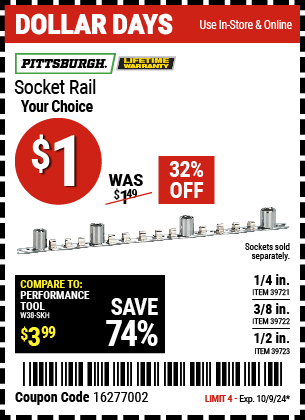 PITTSBURGH SOCKET RAIL Lot No. 39722/39721/39723 Expired: 2/18/24 - $0.99 Coupon Code: '70021889'