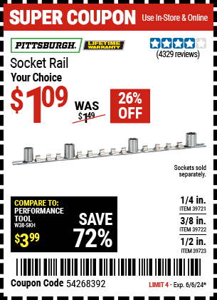 PITTSBURGH SOCKET RAIL Lot No. 39722/39721/39723 Valid Thru: 3/5/26 - $1.29 Coupon Code: 'n/a' (current price - 20% = 0) add to list