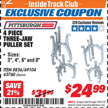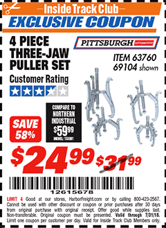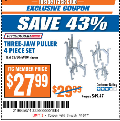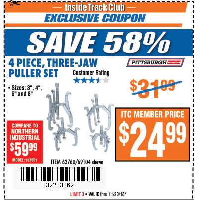 ITC PITTSBURGH THREE-JAW PULLER SET, 4-PIECE Lot No. 63760 Expired: 7/31/18 - $24.99 Coupon Code: '12615678'