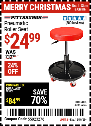 MECHANIC'S ROLLER SEAT, PNEUMATIC ADJUSTABLE ROLLER SEAT Lot No. 61653/3338/61896/61160/63456/46319 Expired: 12/10/23 - $24.99 Coupon Code: '55023276'