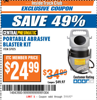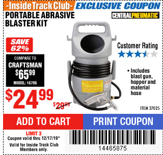 PORTABLE ABRASIVE BLASTER KIT Lot No. 37025 Expired: 12/17/19 - $24.99 Coupon Code: '14465875'