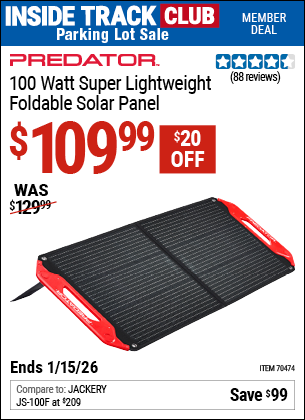 PREDATOR 100 WATT SUPER LIGHTWEIGHT FOLDABLE SOLAR PANEL Lot No. 70474 Valid Thru: 2/16/26 - $119.99 Coupon Code: '24887928' (current price - 20% = 0) add to list
