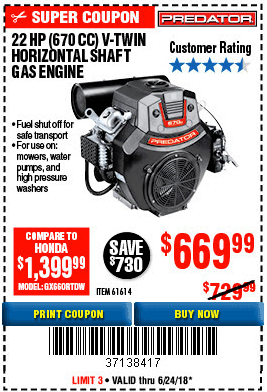 PREDATOR 22 HP (670CC) V-TWIN HORIZONTAL SHAFT GAS ENGINE Lot No. 61614 Expired: 6/24/18 - $669.99 Coupon Code: '37138417'