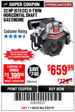 PREDATOR 22 HP (670CC) V-TWIN HORIZONTAL SHAFT GAS ENGINE Lot No. 61614 Expired: 3/3/19 - $669.99 Coupon Code: '61035328'