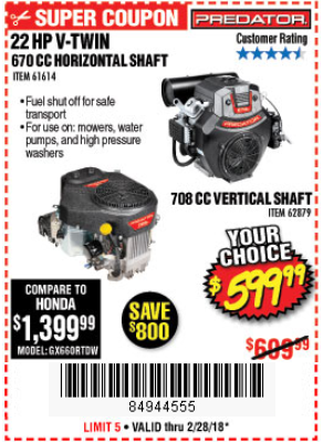 PREDATOR 22 HP (708 CC) V-TWIN VERTICAL SHAFT ENGINE Lot No. 62879 Expired: 2/28/18 - $599.99 Coupon Code: '84944555'