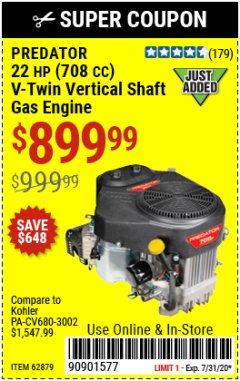 PREDATOR 22 HP (708 CC) V-TWIN VERTICAL SHAFT ENGINE Lot No. 62879 Expired: 6/30/20 - $899.99 Coupon Code: '39416306'