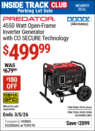 PREDATOR 4550 WATT OPEN-FRAME INVERTER GENERATOR WITH CO SECURE TECHNOLOGY, 49-STATE COMPLIANT Lot No. 59192/59189/59303/59304/72936 Expired: 3/8/26 - $499.99 Coupon Code: 'n/a'